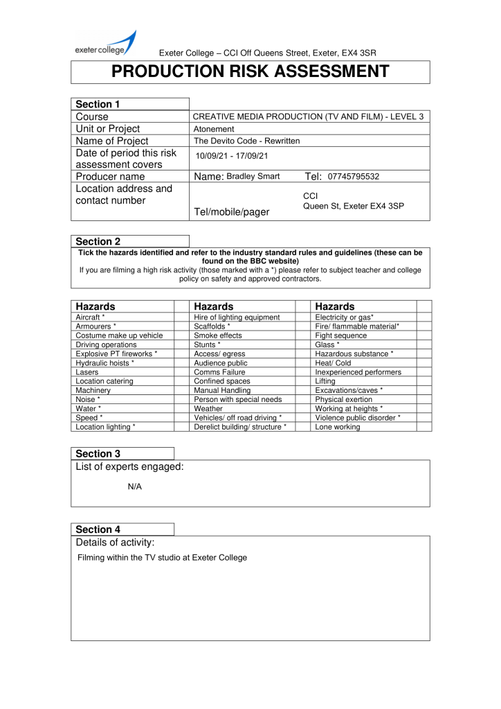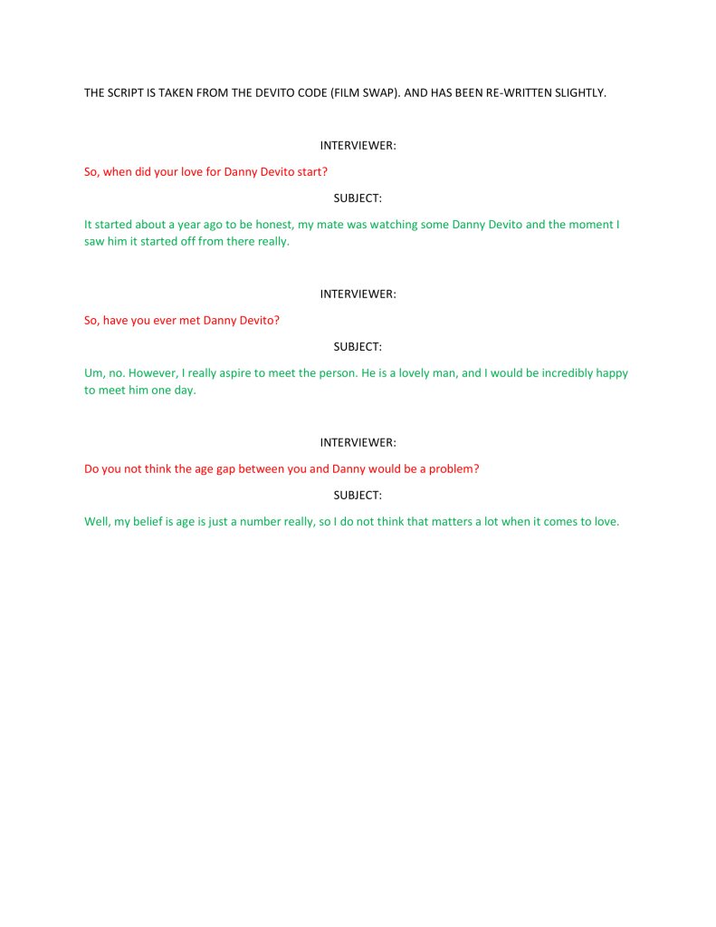 For the Atonement task I decided to re-create part of The DeVito Code from the film swap unit last year. I intentionally chose a portion of the video that I thought was shot very poorly and could be done much better with the new skills that I have learnt over the past year. I have attached the video I recreated below and it starts at the correct point.