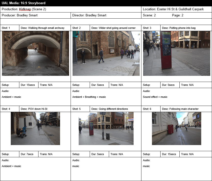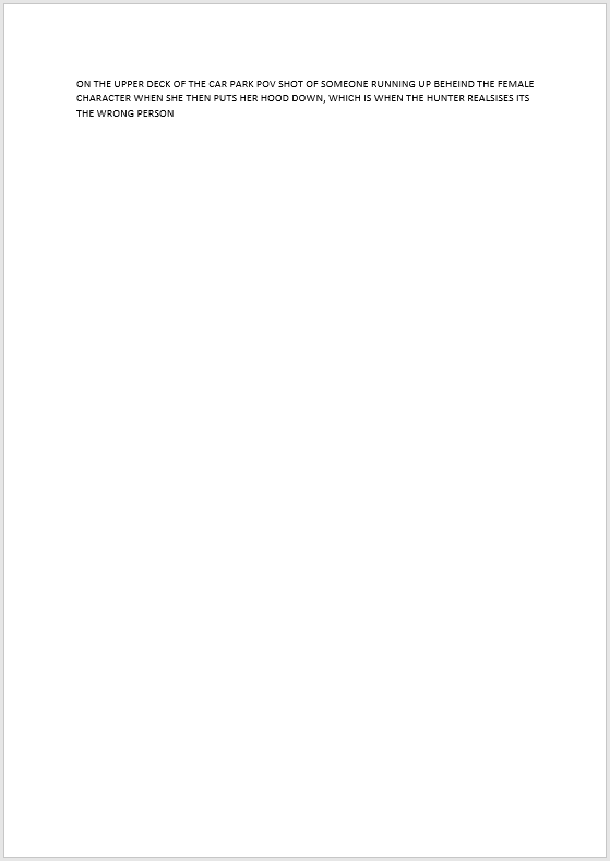 He wakes up the next morning and does the normal morning routine things e.g. grabbing keys, locking door closing window etc… Cut to a shot of him walking through Exeter high street which pans down from the sky to him walking forwards to a moving camera. Close up tight shots of the two hunters walking in the high street too with earpieces and two-way radios so they can communicate between each other, this will also help to make it more obvious that they are the ‘hunters. He should be walking to the top floor of the carpark with only the final shot being of the female. Being approached and then turning around.