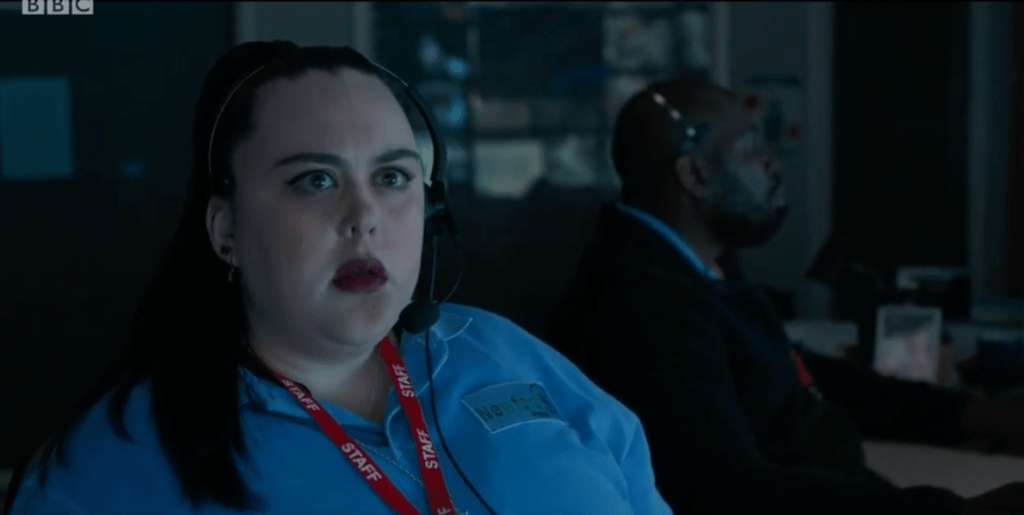 This could be classed as an establishing shot because it does show the location of the control room as it pans around to the left showing multiple camera feeds on separate monitors, at first all of the actors are having a harmless conversation about one of their colleagues going to a different kebab shop while watching him on the CCTV monitor, instead of the one that they asked him to, then the female operator starts talking, reporting a possible fight on Wexley Road beginning with “Sutton south to control possible fight on Wexley road”, while simultaneously panning the camera around to the right from the kebab shop towards Wexley road. The male colleague returns with the takeaway and begins talking to the other male operator about his decision of which shop he chose to go to. We then see a close up of the female operators face as she turns to face a different monitor showing a different location which is closely followed up by an over-shoulder shot of the specific screen, she is looking at which slowly zooms in to a male and female character who are clearly attracted to each other, the camera flips back around to her face which then shows her let out a small but still visible smile, the CCTV images then show the two kissing and is also followed by the operators even bigger and again more visible smile. A bus drives past on the CCTV image and the camera then goes out of focus.