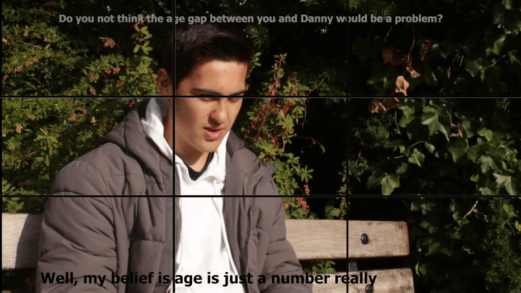 Here I have added a ‘rule of thirds grid’ to a frame within or video and this clearly demonstrates how we framed the shot with Quentin in the foreground and on the intersecting crosses of the grid and the scenery of the bushes and trees out of focus in the background.