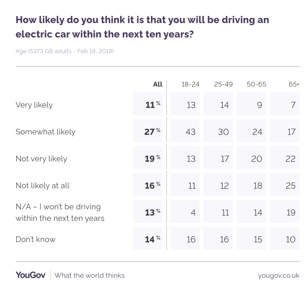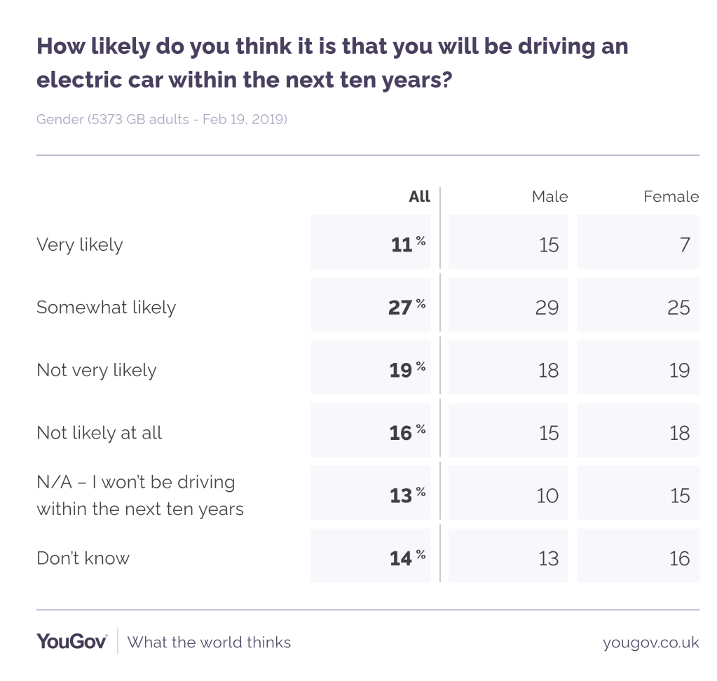 YouGov (2019) How likely do you think it is that you will be driving an electric car within the next ten years?. Available at: https://yougov.co.uk/topics/travel/survey-results/daily/2019/02/19/6b2d3/1 (Accessed: 04/04/21)