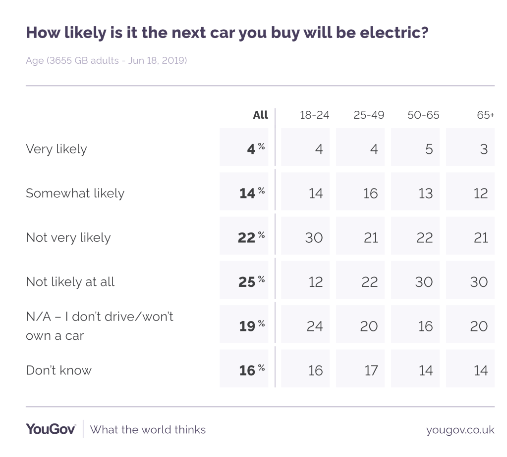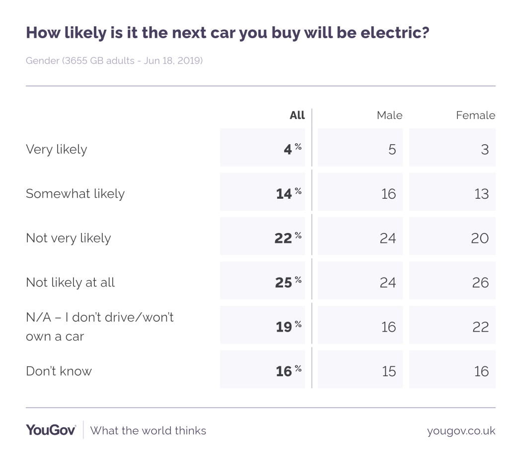 YouGov (2019) How likely is it the next car you buy will be electric?. Available at: https://yougov.co.uk/topics/transport/survey-results/daily/2019/06/18/0a5d3/2 (Accessed: 04/04/21)
