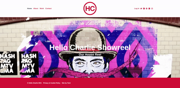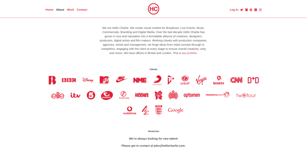 The ‘about’ page continues this same theme of being very brief and the colour theme I discussed above, they have a short paragraph about what they do that is different and how they stand out, this is also commonly different because most companies would have a big page about their story and how they came to be, but it seems like ‘Hello Charlie’ has what I would say a ‘no messing about’ work ethic, and want to work with people rather than tell them about something they may not even read anyway, this is made apparent by the hyperlink to their portfolio at the end of the paragraph, continuing with the colour theme below this paragraph they have the logo of any major company they have worked with but in the same red, this is obviously something that I wouldn’t be able to create and put together immediately but over time you could add to it.