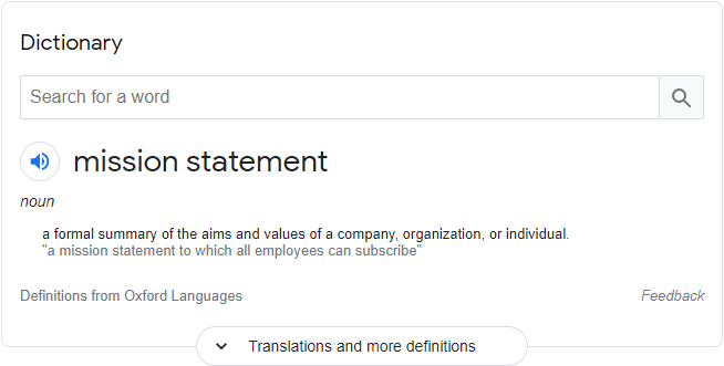 Google (no date) What is a mission statement?. Available at: https://www.google.com/search?q=what+is+a+mission+statement&oq=what+is+a+mission+s&aqs=chrome.0.0i20i263j69i60j0j69i57j0l3.3375j0j1&sourceid=chrome&ie=UTF-8 (Accessed: 26/01/21)