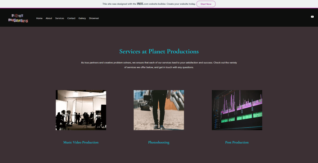 Looking at other students in my class’ sites now: starting with Oliver Stockman’s. His URL is: Home | Planet Productions (wixsite.com). The home page of the site, he has clearly shown use and created himself a colour palate so that he knows which colours to use in certain places throughout his site. Initially we are greeted with a sort of ‘about column’ telling the viewer what the company does, this is different in comparison to my site where I went for a more visual approach showing the viewer an example of some work rather than worded information. He has also used a header on the site which should make it easier to navigate, although I would change this horizontally so that the header is smaller (see below). He has also taken a similar approach where he used moving images as the page is scrolled through which generally makes it more interesting. Also, to further the online presence of the company he has created a YouTube channel where he will presumably upload examples of work and advertisement videos. It looks like there are some finishing touches need to be made but apart from that it is complete.