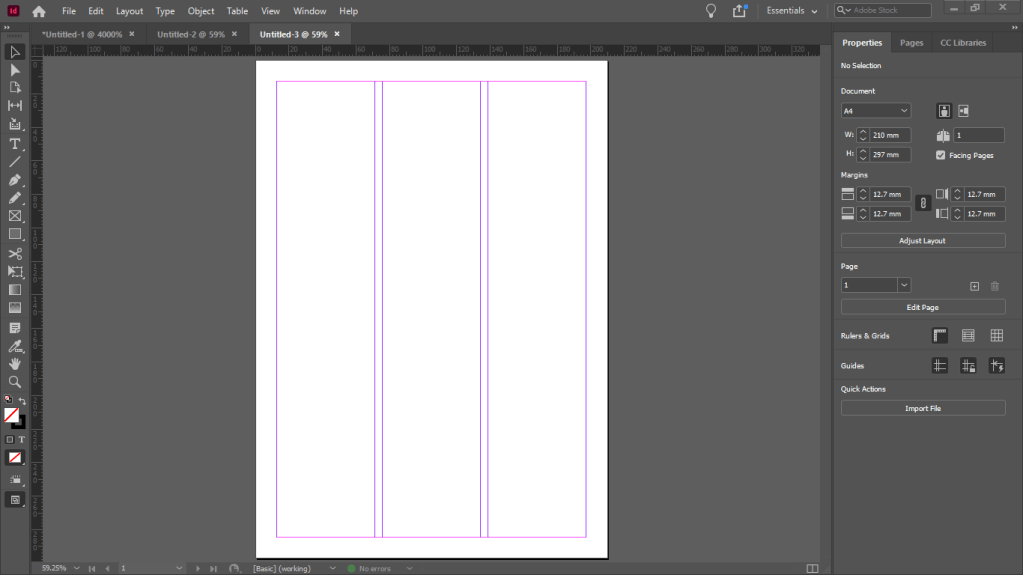 File, New, Document. Choose a pre-set, or specify measurements on the right, specifying the columns and the column gutter and hit ‘Create’.