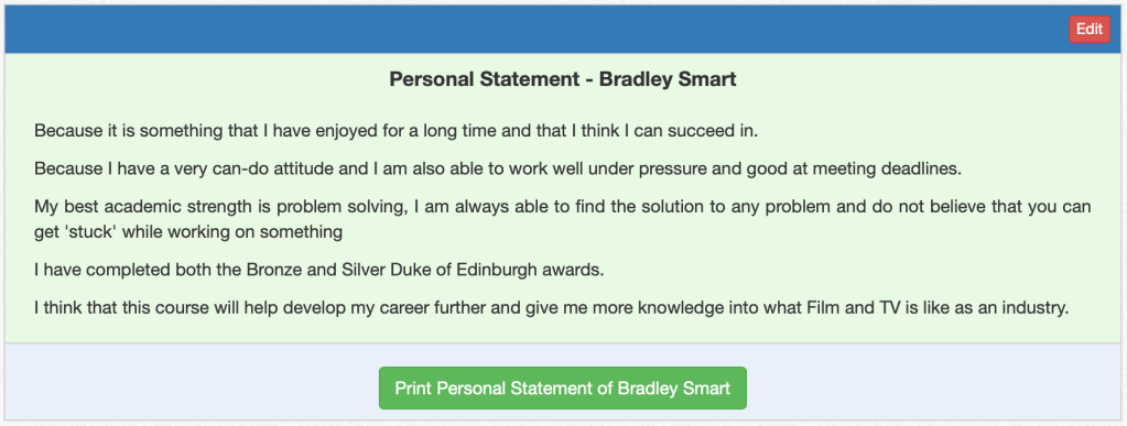 I generated this personal statement using the ‘ulearn’s personal statement generator’. It asks questions and then uses the answers to create and build up a personal statment.